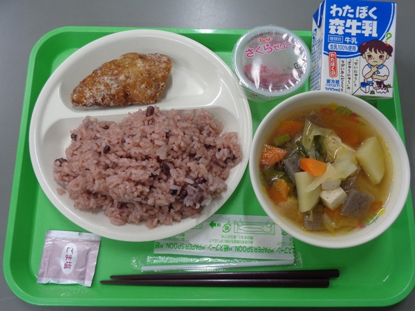 今日から、2~6年生の給食が始まります。給食を楽しみにしていた子も多かったのではないでしょうか。赤飯や春野菜のけんちん汁、さくらゼリーなど、春らしいメニューで子どもたちの進級をお祝いします。教室を覗くと、笑顔で友達と喫食する子どもたちの姿がたくさん見られました。