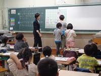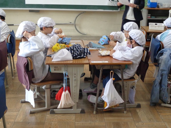 教室をのぞくと、1年生が給食の用意をしています。給食開始日は4月17日ですが、きちんと準備ができるように練習します。給食着の着方、机の移動の仕方、机の上のナフキン等の準備の仕方など、一つひとつ丁寧に確認します。給食開始が楽しみですね。午後は、2年生の授業参観がありました。どのクラスも算数の授業です。一人ひとりが自分の似顔絵や名前、誕生日をかいたカードを作り、月ごとにカードを貼って分類します。先生から「毎回このカードをかいて貼っていくのは大変だよね。簡単に表す方法はありますか?」と発問され、一人ひとり簡単にする方法を考えます。教師側は、「○で表すと簡単」など表やグラフにつなげていけるような意見を期待しますが、子どもたちは、「名前をフルネームではなく、下の名前だけを書く。」など、カードをかく時間を短縮する方法を考えていました。たくさん考えながら、具体を抽象化する考え方を身に付けていけるとよいですね。
