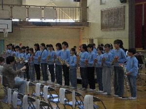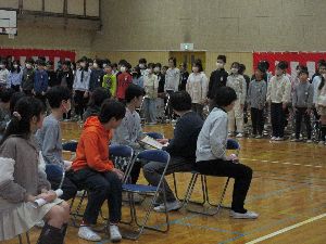 今日は、体育館で6年生を送る会を行いました。1~5年生、みやのこ学級から、6年生への感謝の気持ちを歌、リコーダー、群読、劇などで伝えました。6年生は、手作りの雑巾、合唱とリコーダーの合奏を在校生にプレゼントしてくれました。雑巾には、大宮小をきれいにしてほしいという思いが込められています。お互いに感謝の気持ちを伝え合う、温かい雰囲気の会となりました。