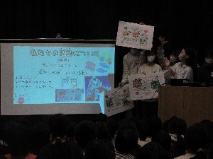 今日は、休み時間に5年生がおおきな時間(総合的な学習の時間)に取り組んできたことについて、プレゼンテーションを行いました。児童の有志によるプレゼンテーションでしたが、多くの発表者、参加者が集まり、多目的室に入りきらないほどでした。5年生はSDGsをテーマに学習を行ってきており、発表では、ごみ問題や食品ロスを解決するための具体的な取組について、分かりやすく紹介してくれました。