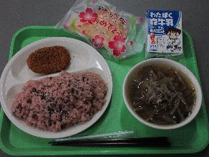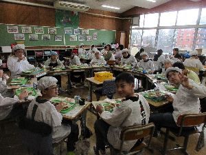 今日で、令和7年度の給食が最後です。今日は卒業や進級のお祝いメニュー。お赤飯やお祝いいちごクレープなど、とても華やかです。6年生は小学校生活最後の給食です。これまで1000食は食べてきたでしょうか。友達と色々な話をしながら、笑顔で給食を食べていました。これまでに思い出に残った給食について質問してみると、「この前出た6年4組がメニューを考えた給食」「4年生の頃に1回だけ出た黒チャーハン」「春雨サラダ」「みんなで円になって食べたクリスマス給食」「味は忘れたけど1年生の頃に出た給食」など、一人ひとり様々な思い出があるようです。6年間、たくさん食べてくれてありがとう。1~5年生は来年度の給食も楽しみにしていてくださいね。