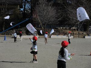 教室を見回っていると、1年生が生活科の学習で昔遊びに取り組んでいました。けん玉、お手玉、コマ、だるま落としなど、それぞれのブースに分かれ、一生懸命に取り組んでいました。校庭では、凧揚げをしています。近くの児童と糸が絡まらないよう、糸を少し短めにし、思い切り校庭を走り回っていました。寒さが厳しくなってきていますが、教室でも校庭でも子ども達は元気いっぱいです。
