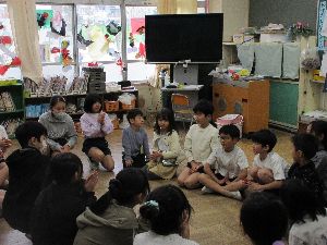 今日は、1月のおはなし会です。図書ボランティアの皆様より、「すてきなセーター」というお話を読み聞かせしていただきました。これは、以前本校敷地内にさいたま市立幼児教育センター付属幼稚園があった頃に作られたオリジナルの紙芝居だそうです。学級閉鎖中のクラスもあり、いつもより参加する児童は少し少な目でしたが、楽しそうに絵本の世界に浸ってました。校庭では、風邪や寒さに負けず、あおぎりっ子達が元気いっぱいに遊んでいました。校庭にある梅の木にも花が咲き始めました。少しずつ春の訪れを感じられるようになりましたが、まだまだ寒い日が続いています。保護者や地域の皆様も、体調にご留意してお過ごしください。