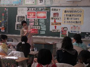 今日は、歯科衛生士の方々にお越しいただき、5年生の歯科巡回指導を行いました。歯ぐきが赤く腫れたり出血したりする歯肉炎を予防するための歯磨きの仕方について、丁寧に教えていただきました。子ども達は、プラークを染め出す液を使用して自分の磨き残しを確認し、1本ずつ丁寧に磨きました。子ども達からは、「自分が思っている以上に磨けていないことが分かった。」「教えてもらったポイントを意識して歯磨きをしていく。」などの振り返りがありました。教えていただいたポイント、①毛先を歯にきちんとあてる、②軽い力でみがく、③小きざみに動かすことを意識して、これからも自分の歯を大切にできるとよいですね。
